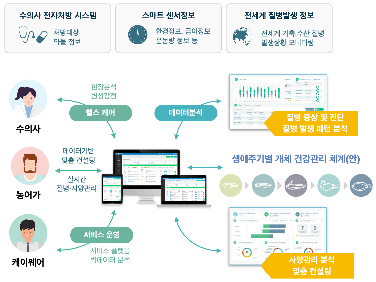 센서, 자동 관개 시스템, 현장 정보관리 시스템, 질병진단 정보관리 시스템 및 기상 관측정보를 제공함으로써 생육 및 질병 관련 데이터 통합관리와 분석이 가능한 플랫폼을 통해 보다 생산적인 스마트 농축어업 환경을 구축합니다.